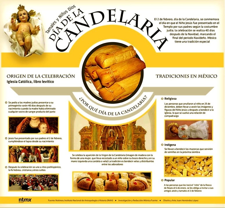 El día de la Candelaria se festeja 40 días después de Navidad, es decir el 02 de Febrero, debido a que ese día como lo dictaba la ley judía, se tenía que llevar a los niños a presentar al Templo y como signo de purificación de las mujeres después del parto, se tenían que llevar candelas para que fueran bendecidas. Éste festejo era el original, sin embargo cuando llegaron éstas costumbres a México, el día de la Candelaria coincidió con la temporada de siembra que iniciaba el 02 de Febrero y se festejaba con exquisitos «tamales» como platillo principal.
